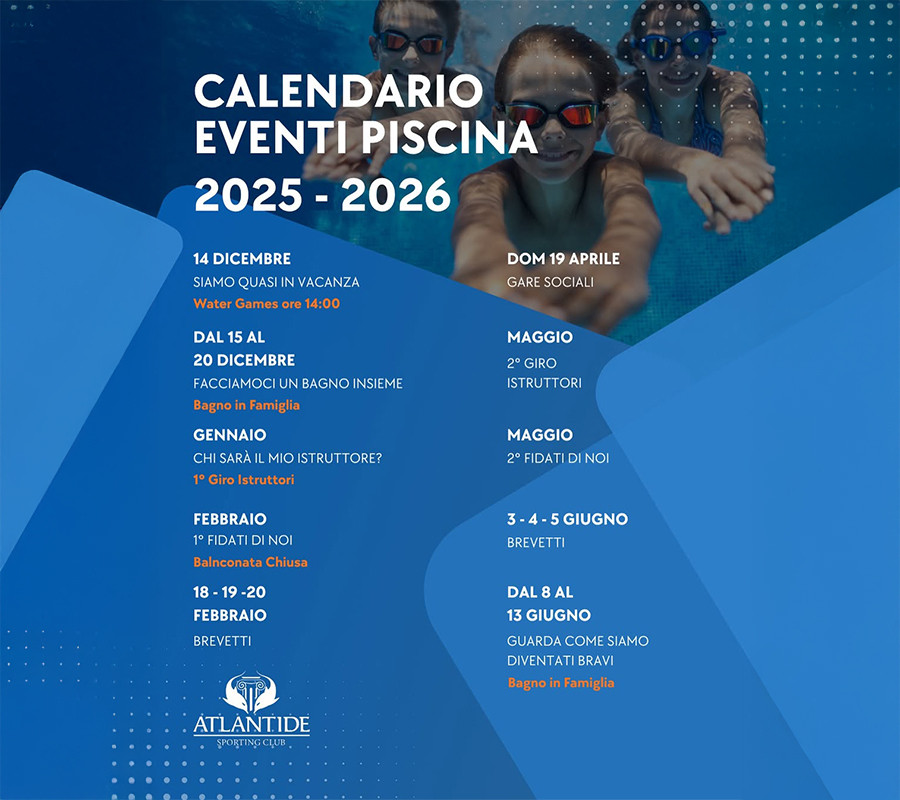 Atlantide presenta il nuovo Calendario Eventi Piscina 2025–2026! Un anno intero di attività, divertimento e crescita — dentro e fuori dall’acqua!Scopri tutte le...